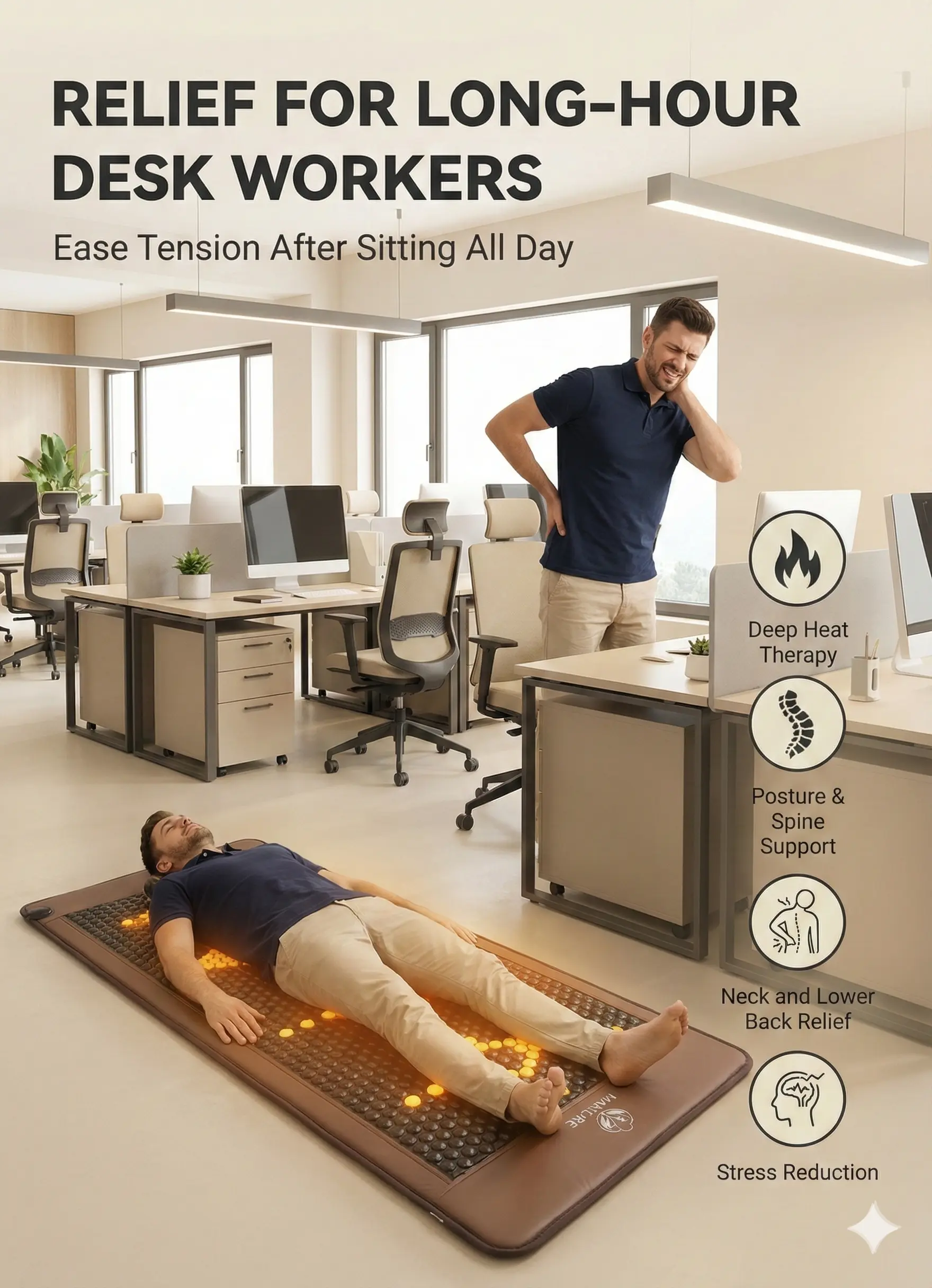 The mat delivers consistent deep heat that relaxes muscles, improves blood circulation, and reduces stiffness—helping your body recover naturally.